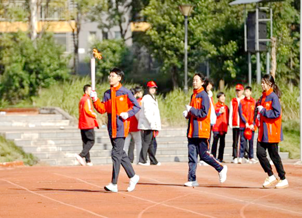 话音未落,全场掌声雷动、欢呼声四起,礼炮齐鸣间彩花漫天飞舞,将现场热度推向顶点。郑文东书记随即点燃象征着体育精神与青春力量的火炬。火炬手在全场师生的呐喊与注视中,迈着矫健的步伐绕操场奔跑一周。火炬跳动如焰,引燃沿途热情,欢呼声不绝于耳。