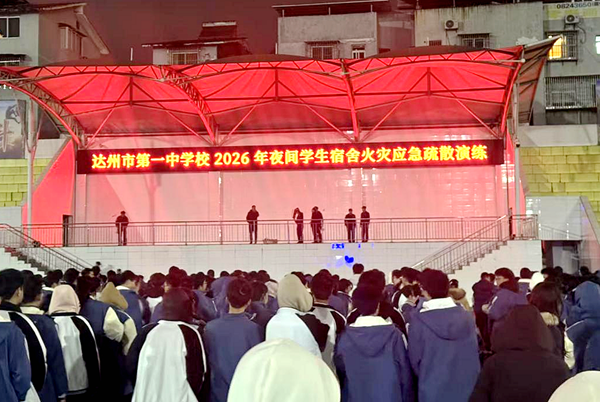 为严格落实校园消防安全管理要求,切实提高师生应对突发火灾的应急处置与自救互救能力,1月20日18时50分,达州市第一中学校组织高一至高三及初中部全体住校生,开展了一次贴近实战的夜间寝室火灾应急疏散演练。活动全程由班主任、宿舍管理员、校医及消防队专业人员协同参与、现场指导,实现了“准备充分、组织有序、撤离迅速、教育到位”的良好效果。