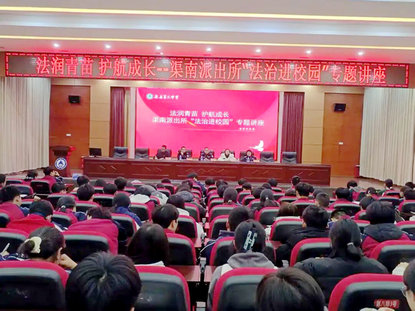 为增强学生的法律意识和自我保护能力,营造平安和谐的校园环境,3月19日,渠县第二中学在新会议室举办主题为“法润青苗 护航成长”的法治教育专题讲座。活动由政教处承办,特邀渠县渠南派出所所长郑府,民警廖海玲、许明波到校主讲。学校党委副书记沈秀梅出席活动并致辞,各班班长、团支部书记、纪律委员、安全委员等师生代表共计500余人聆听讲座。