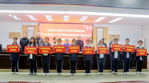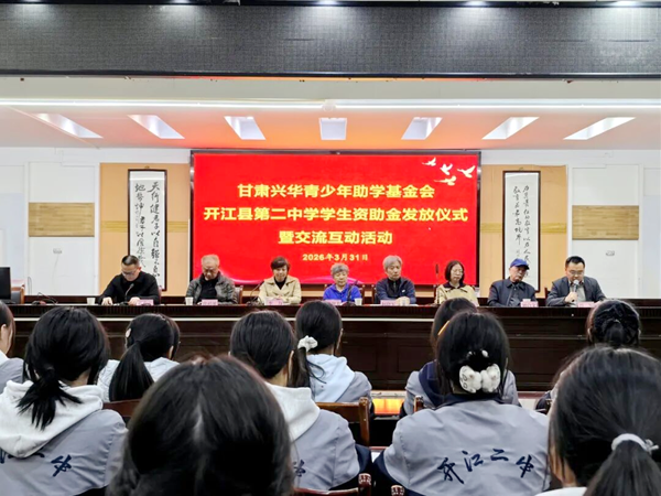 2026年3月31日,甘肃兴华青少年助学基金会爱心团队莅临开江县第二中学,开展学生资助金发放仪式暨交流互动活动。兴华基金会四川受托人曾智芳携爱心人士何晓军、李力、代静,达州市乡村振兴服务中心覃琳,县关工委刘启文、曾祥风等市县领导及学校领导、师生代表共同参与活动。本次活动设置了助学金发放仪式、学生座谈交流及受助学生家庭实地走访等环节,以多元形式传递关怀,既为学子提供切实的物质帮扶,也送上丰盈的精神滋养。