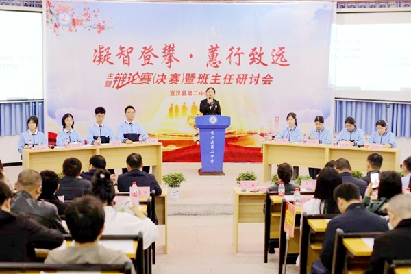 为深度挖掘中华优秀传统文化的当代教育价值,探索高中班级管理的智慧之道,4 月10日下午,宣汉县第二中学以“凝智登攀・蕙行致远”为主题,举行主题辩论赛(决赛)暨班主任研讨会。本次辩论赛以“问道孔庄・思辨育人”为核心,聚焦千古教育之问——“教,何以育人?”,将儒家“有为规矩”与道家“无为自由”的教育智慧融入思辨现场,为全校师生呈现一场兼具思想深度与教育温度的文化盛宴。学校党委班子成员、各部门负责人,全校班主任及家长代表、各班学生代表参加了活动。