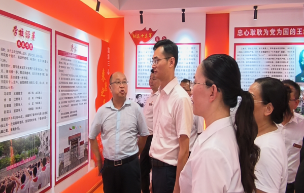 胡锐一行顶着酷暑来到学校,参观教学楼、红色文化教育中心、党员活动室等,了解学校历史、校园环境和文化建设。程临莉汇报了学校的基本情况、办学特色、师资力量和办学成效。