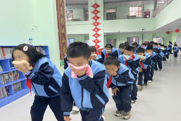 下午1点40分,“呜——”随着应急避险的警报声响起,消防演练正式开始。班主任迅速就位,指挥学生用折叠三次的湿方巾捂住口鼻,弯着腰迅速按指定线路迅速有序撤离到操场。