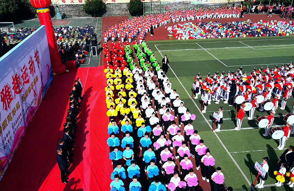下午两点,冬阳微醺,出席开幕式的领导和观众到达指定区域。在激昂的进行曲中,国旗方队、校旗方队、彩旗方队、鼓号队及各年级表演方队、运动员方队有序入场。待所有人入场后,庄严的升旗仪式开始。全场近五千人面向国旗,高唱国歌,表达对党和祖国的热爱之情。升旗仪式结束,胡家镇镇长文跃发表讲话。他首先表达了对躬耕教坛,潜心育人的教师的祝福,对裁判员、运动员的亲切慰问。他指出,多年来,胡家镇小学忠诚党的教育事业,为党育人,为国育才,特别是近年来,坚持“雅行天下,趣立真我”办学理念,确立“以体育人,促进全面发展”育人思路,践行习近平教育思想,走出了一条创办高品质学校的新路径,是胡家人民之福,更是胡家青少年之幸。他希望全胡家人民积极参加体育运动,炼好身体,为建设美丽繁荣新胡家做出贡献。接着,裁判员代表、运动员代表宣誓。最后,宣汉县教育局副局长郑磊宣布开幕。