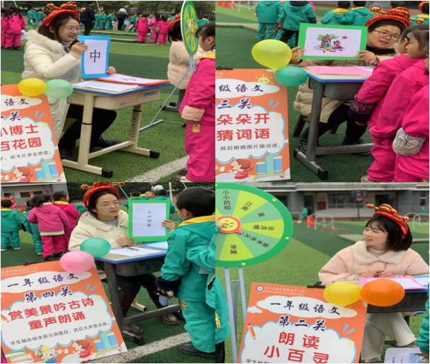 语文组设计“识字小先锋”“读一读”“说话小超人”“书法屋”四个关卡分别考察“识字辨字”“积累背诵”“口语表达”等。瞧,一年级的小朋友们过关斩将,口吐莲花,落落大方,洋溢的笑脸绽放出娇艳的花朵,秀出不一样的风采!孩子们不再被考分定义,而是个个等着施展拳脚,在闯关游戏中成为“通关大王”。
