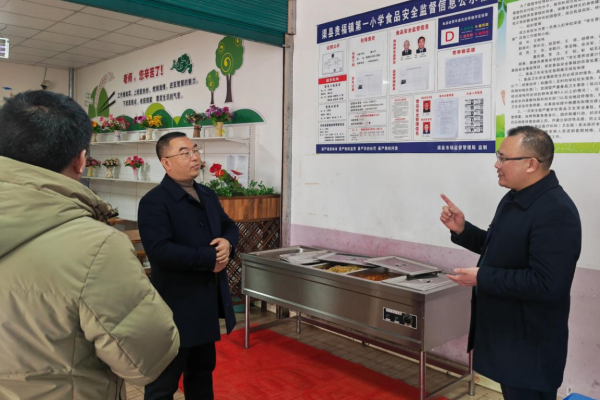 在贵福镇第一小学,董之平仔细查看了食堂餐厅、清洗间、操作间、食品储藏室、食品留样室等场所,听取了学校关于食品安全管理制度建设及落实情况汇报,并详细询问了学校食堂从业人员健康管理、食品进货查验、冷链食品购进、餐具清洗消毒、燃气报警装置等情况。他对该校在食品安全管理工作给予充分肯定,也对食品溯源等方面提出了新的要求。他强调,学校要严格落实食品安全责任,做好操作间环境、原料索证索票及储存、餐用具消毒等关键环节的把关,随时做好风险隐患排查,全力保障师生饮食安全。