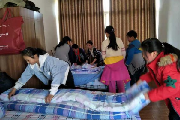 政教团队带领学生帮助独居老人整理内务,和他们亲切交谈。