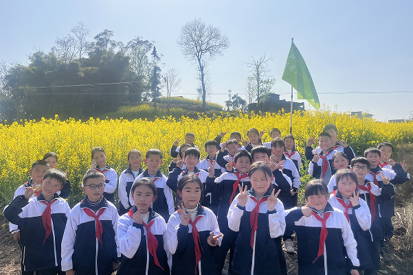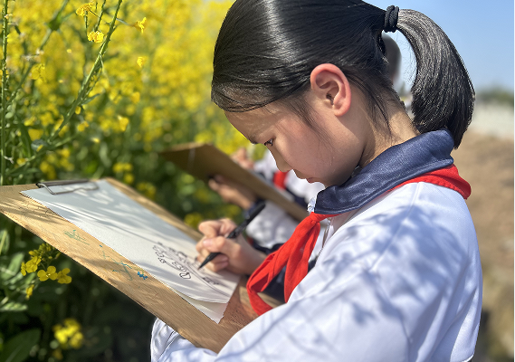 柔和的春风,芬芳的花香,温暖的阳光,绽放的笑脸,悦动的身影……大家尽情地享受着大自然的馈赠,探寻春日的美好。油菜花恰逢花期,放眼望去,尽是一片金色的灿烂。盛开的油菜花与小山村的纯朴农舍相融,构成了一道美丽的风景。百亩花田金黄明艳,同学们徜徉在花海中,赏花留影,用小小的画笔给白纸穿上了一件五彩的衣裳,为春姑娘增衣添彩, 以歌唱、手势舞等形式歌颂春天的美好,感受人与自然融为一体的快乐与惬意。