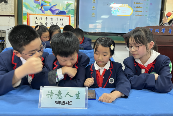 飞花令环节更是让现场观众叹为观止。主持人鼠标轻轻一点,五年级组“山”字飞花令已经让人目不暇接:“西塞山前白鹭飞,桃花流水鳜鱼肥”“白日依山尽,黄河入海流”“会当凌绝顶,一览众山小”“空山不见人,但闻人语响”......整整六轮,带“山”字的诗词声此起彼伏,掌声连绵不断。