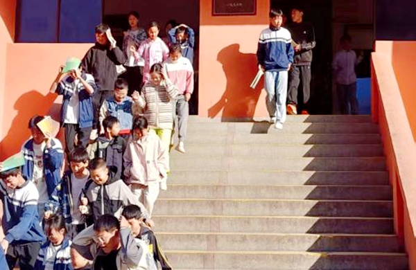 随着办公室接到模拟的“教学楼有坍塌危险”的紧急报告,总指挥李小林校长迅速下达启动应急疏散预案的指令。校园广播响起了急促的警报声,各班级班主任和科任老师第一时间停止授课,迅速组织学生进行应急避险。学生们反应迅速,在老师的指挥下,低头弯腰,用书本、书包等硬物护住头部,躲在课桌下或墙角处。当第二次警报声响起,学校广播发出“现在是应急疏散演练,同学们请在老师的指挥下,选择最近的逃生出口,按照安全逃生指示标识有秩序地进行疏散”的指令时,师生们迅速行动起来。各楼梯口负责值守的老师提前到岗,指挥学生安全撤离。