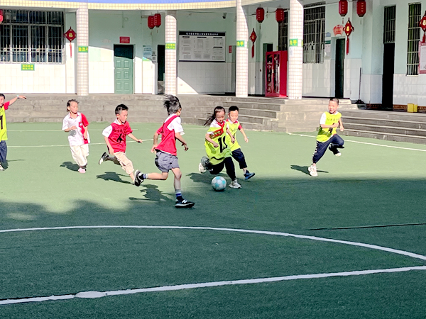 在比赛期间,孩子们在运动场上展开着激烈的角逐。前锋们穿梭在对方的防线之间,寻找着破门的机会;中场球员们巧妙地组织着一次次进攻,将球精准地输送到队友脚下;后卫们也毫不懈怠,他们全力阻拦着对方的进攻,一次次化解危机;守门员更是全神贯注,随时准备做出精彩的扑救。场边的啦啦队员们他们挥舞着小手,为自己班级的球队加油助威。“加油!加油!”呐喊声此起彼伏,为比赛增添了热烈的氛围。