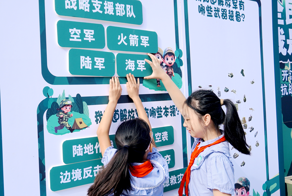 活动现场,学校精心打造了一条“国防教育长廊”,特别设计了“小小兵”国防知识互动打卡区。孩子们兴奋地穿梭于“解放军军种知多少”、“厉害了,我的国之装备”、“解放军叔叔的本领”等主题互动区,通过趣味贴纸打卡、图片识别、模型观看等寓教于乐的方式,对海、陆、空、火箭军等不同军种有了初步的认识,同时也对我国自主研发的先进武器装备产生了浓厚的兴趣。一张张稚嫩的脸上写满了对国防知识的渴求与对军人的深深崇敬。