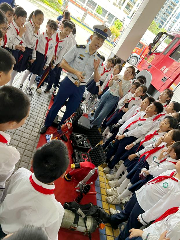 在消防员叔叔的引导下,同学们首先参观了消防车辆和随车器材装备。面对高大的消防车、威力巨大的液压剪、形状各异的破拆工具以及那“神秘”的消防服,孩子们发出了阵阵惊叹。消防员耐心细致地讲解了各种器材的名称、功能和使用方法,并现场进行了演示。他们用浅显易懂的语言,为同学们介绍了如何预防火灾、火灾发生时如何报警、如何自救逃生等基本消防知识。一堂生动的“消防安全课”在互动与问答中进行,同学们听得聚精会神,积极提问,现场气氛十分活跃。