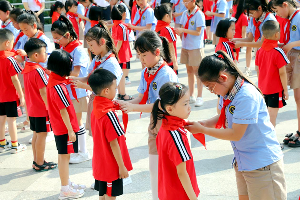 在大队辅导员宣读新队员名单后,老队员为新队员佩戴上鲜艳的红领巾。这一刻,荣誉与责任在胸前交织,新队员昂首挺胸,眼中闪烁着自豪的光芒。在大队长的领誓下,铿锵誓言回荡校园,拳拳童心向党而生。