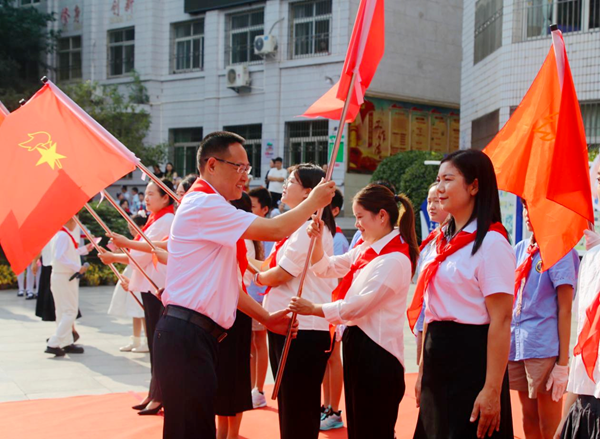 学校党支部书记、校长郝朝庄为新建中队授旗,党支部副书记为中队辅导员颁发聘书。一面队旗象征一份使命,一份聘书承载一份责任。仪式上,学校还对50名获得“红领巾奖章”的优秀少先队员进行表彰,树立先进榜样,激励新队员勤勉向上。