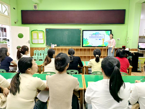 培训中,保教主任王雯老师围绕“教学简笔画实用技巧”展开讲解。她结合幼儿园常见教学场景,从线条运用、造型简化、色彩搭配三个核心维度入手,手把手示范如何快速画出动物、植物、卡通人物等教学常用形象,还现场指导教师根据不同年龄段幼儿认知特点,调整简笔画的复杂度与趣味性。