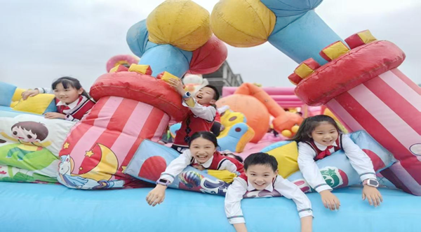 上午的启动仪式上,随着老师宣布研学开始,各班级有序展开活动。射箭区里,攥着箭柄的小手用力拉满弓弦,箭头“嗖”地划破空气,哪怕脱靶也惹得同伴们笑着鼓掌;丛林穿越的绳索桥上,小身影们勾着安全绳、踮脚踩过晃动的踏板;充气城堡里,红白校服像纷飞的花瓣,孩子们蹦蹦跳跳,连发丝都沾着雀跃的气息;游乐场的滑梯、秋千旁更是排起小队,排队时的碎碎念、玩闹时的尖叫,把秋日的乡野变成了装满快乐的“自然游乐园”。