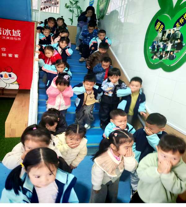 在疏散过程中,孩子们不推不挤,听从指挥,动作规范。楼梯口、转弯处,均有后勤人员和安全岗老师指引护卫,确保整个疏散过程安全无障碍。仅用时2分15秒,全园数百名师生全部安全撤离到指定的户外安全区域。