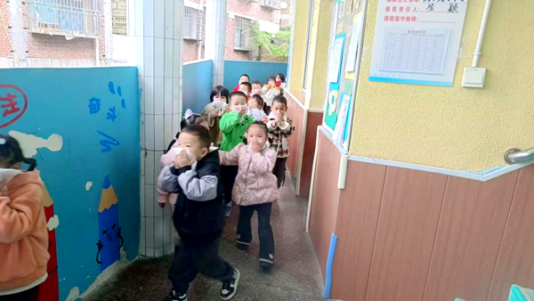 随着一阵急促的消防警报声响起,演练正式开始。全体教师迅速反应,按照预设方案,立即组织幼儿用湿毛巾捂住口鼻,弯腰、低头、扶墙,在教师的有序带领下,沿着指定疏散路线快速撤离至幼儿园操场的安全区域。整个疏散过程紧张有序,无拥挤、无遗漏,从警报响起至全体师幼安全集结,仅用了5分钟。