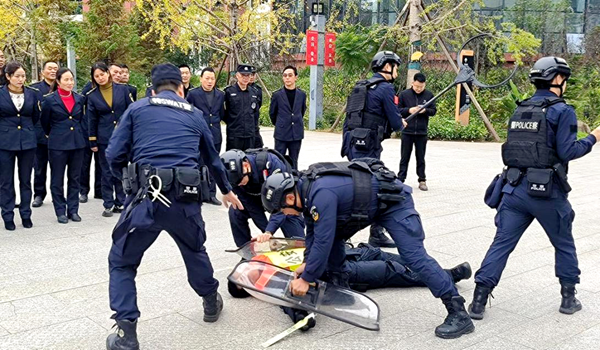 在现场教学环节,特警对防爆盾牌与防暴棍的使用要诀进行了细致传授,并进行操作示范。使用防爆盾牌时,双手紧握握把,双臂紧密贴合肋骨部位,确保盾牌呈 15 度斜面且高于头部,双脚前后开立并弯曲,以保持稳定防御姿态。防暴棍的攻击要点在于针对暴力人员大腿后侧神经肌肉群实施精准击打,使其短时间内丧失行动能力。安保人员两两协作,盾牌手在前,防暴棍手在后,相互配合组成紧密防御阵型,并且能够依据现场态势灵活切换至进攻模式,借助盾牌的推力破坏暴恐分子的身体平衡,进而协同身后战友将其制服,并迅速以脚踢开其手中危险物品。四人协作时则分为两组,左右包抄夹击暴恐人员,一组负责吸引其注意力,另一组捕捉时机果断进攻。