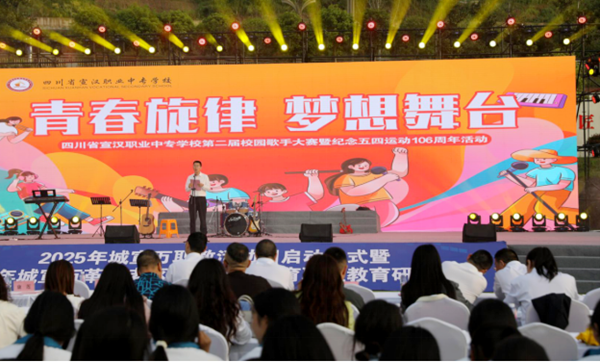 当青春旋律遇见百年薪火,当艺术激情碰撞家国情怀,一场跨越时空的青春对话在宣汉职专的夜空璀璨绽放。4 月 16 日晚,宣汉职专田径场灯光璀璨,歌声飞扬。“青春旋律·梦想舞台” 第二届校园歌手大赛暨五四运动 106 周年纪念活动盛大启幕。全校师生10000 余人齐聚于此,共同见证了一场融合音乐魅力与家国情怀的视听盛宴。