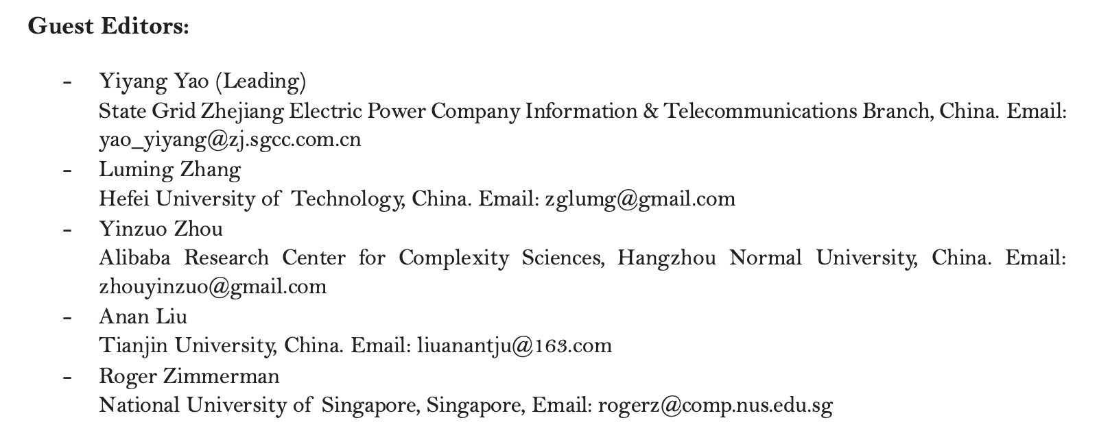 巧合的是,该特刊的客座编辑(Guest Editors)分别来自国网浙江省电力公司信息通信分公司(State Grid Zhejiang Electric Power Company Information &Telecommunications Branch)、合肥工业大学(Hefei University of Technology)、阿里巴巴复杂科学研究中心(Alibaba Research Center for Complexity Sciences)、天津大学(Tianjin University)、新加坡国立大学(National University of Singapore)。新加坡国立大学被撤的两篇论文与国网浙江省电力公司信息通信分公司有合作。
