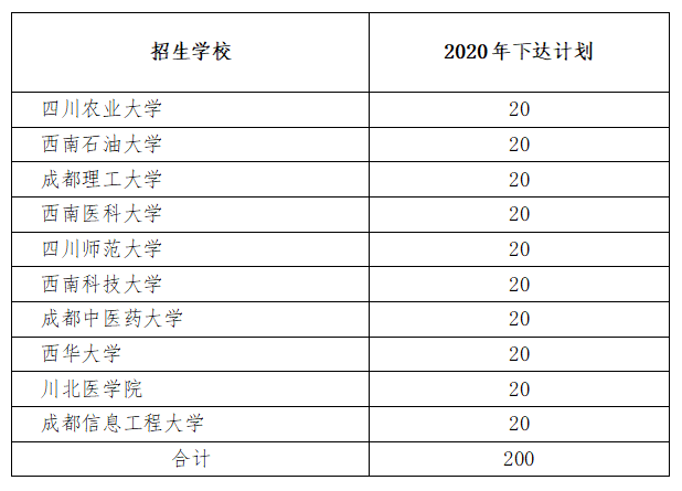 深贫县帮扶计划由参加四川省本一批次录取的省属本科院校承担,并安排在本一批次录取的专业招生。2020年计划安排200名,纳入省下达的各校招生年度总规模。