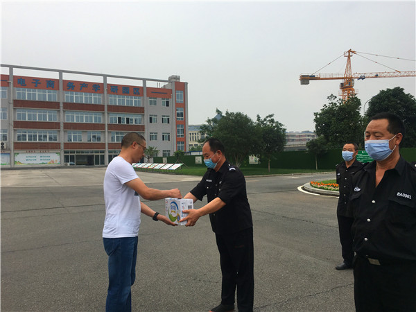 为进一步做好暑假期间疫情防控常态化工作,及时把学校的关心关爱送到工作在一线的保安队员中,近日,四川省商贸学校校长董福海率工会、保卫处等相关部门负责人看望慰问了该校全体保安队员,向不畏酷暑坚守岗位的保安队员们致以亲切的慰问,并向每位队员送上一箱牛奶。