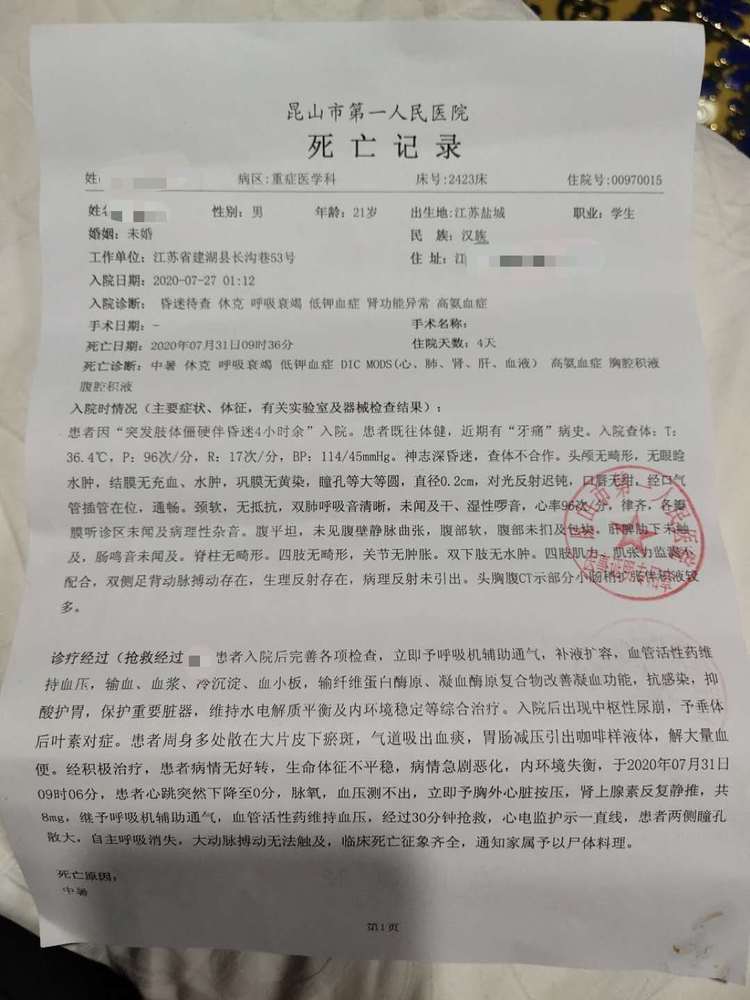 7月31日,仇学金因抢救无效死亡。昆山市第一人民医院死亡记录显示,仇学金入院时已经出现昏迷、休克、呼吸衰竭等症状。死亡诊断系:中暑、休克、呼吸衰竭、低钾血症等。多名医生向上游新闻记者表示,低钾血症的诱因之一就是高温。
