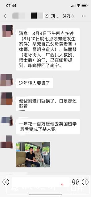 黄律师夫妻遇害的消息已在南宁律师圈子内流传。据一名接近黄律师的同行介绍,黄某此前在英国留学,回国后因要再次出国与父母发生矛盾。矛盾激化行凶后,将空调温度调低,拿到钱后潜逃,在柬埔寨被抓。广西另一名律师称,此事确实,但8月20日,开屏新闻从多个信源获悉,广西南宁一男子杀害父母后在柬埔寨被抓。