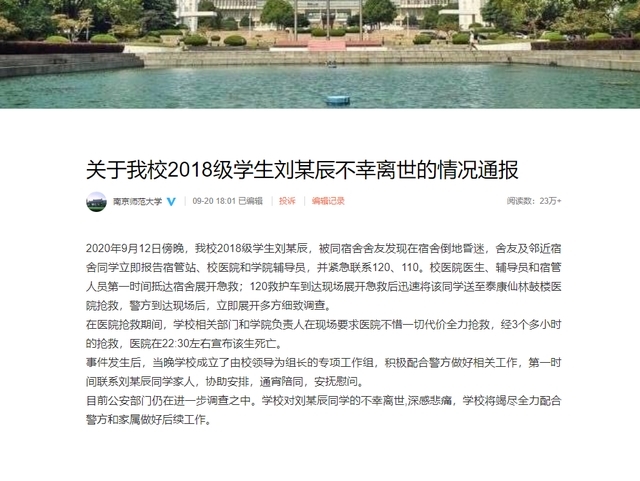 9月20日晚间,南京师范大学发布通报回应: