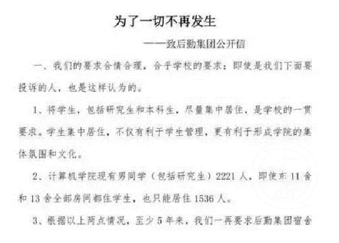 公开信显示,至少5年前,计算机学院就向后勤集团宿管中心提出学院学生集中居住的诉求,但相关领导“不予理睬”,甚至将反映情况的书面报告“弄丢了”。
