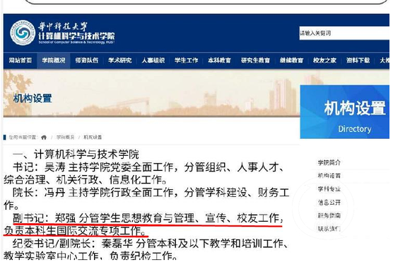 华中科大计算机学院官网显示,学院党委副书记郑强分管学生思想教育与管理等工作。华中科大计算机学院 图
