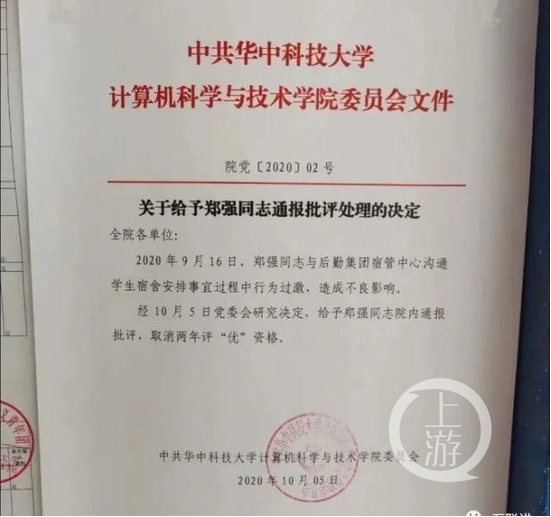 为让一个班的学生住在一起,华中科技大学计算机科学与技术学院(以下称计算机学院)党委副书记、教授郑强,先是掀翻后勤经理的桌子,在受到处分后发表公开信“讨伐”该校后勤集团相关领导,引发网络热议。