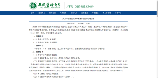 前述《招聘公告》还称,体检、考察结束后,依据招聘公告规定和体检、考察结果,学校集体研究确定拟聘人员,并在安徽医科大学人事处网站进行公示。