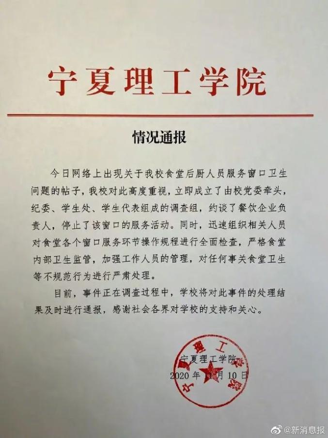 宁夏理工学院发布的《情况通报》回应称,学校对此高度重视,立即成立了由校党委牵头,纪委、学生处、学生代表组成的调查组,约谈了餐饮企业负责人,停止了该窗口的服务活动。同时,迅速组织相关人员对食堂各个窗口服务环节操作规程进行全面检查,严格食堂内部卫生监管,加强工作人员的管理,对任何事关食堂卫生等不规范行为进行严肃处理。