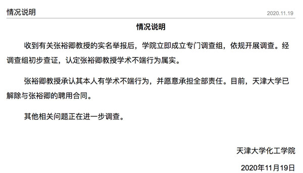 针对“教授张裕卿被实名举报学术不端”一事,11月19日,天津大学在其官网发布通报称,收到有关张裕卿的实名举报后,学院立即成立专门调查组,依规开展调查。经调查组初步查证,认定张裕卿学术不端行为属实。张裕卿承认其本人有学术不端行为,并愿意承担全部责任。目前,天津大学已解除与张裕卿的聘用合同。其他相关问题正在进一步调查。