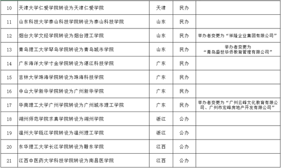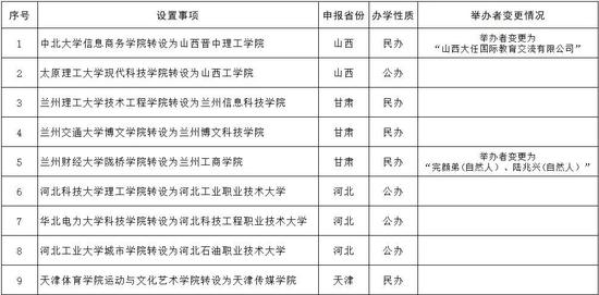 教育部发展规划司表示,根据《高等教育法》《普通高等学校设置暂行条例》《普通本科学校设置暂行规定》和《关于加快推进独立学院转设工作的实施方案》等法律法规政策规定,经第七届全国高等学校设置评议委员会专家考察和评议,并经党组会审议,拟同意中北大学信息商务学院等33所独立学院转设为独立设置的本科学校,现将学校名单等信息向社会公示。公示时间为2020年12月24日至2021年1月7日。