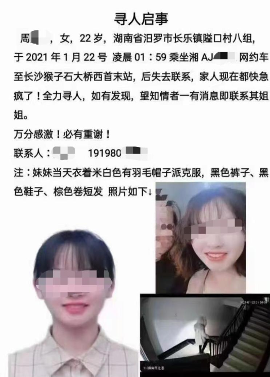 网传失联女生家属发布的《寻人启事》显示,22岁的周某某于2021年1月22号凌晨01 : 59乘坐一辆网约车,至湖南长沙猴子石大桥西首末站,后失去联系。文中描述她留着棕色卷短发,当天衣着米白色有羽毛帽子派克服,黑色裤子、黑色鞋子,并配有女生照片。“家人现在都快急疯了,全力寻人,如有发现,望知情者一有消息即联系其姐姐。”