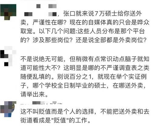 但另有网传统计称“全国共有700万外卖小哥”。就这样,两个并不具有代表性的“1%”,被自媒体简单渲染成“全国七万硕士在送外卖”。