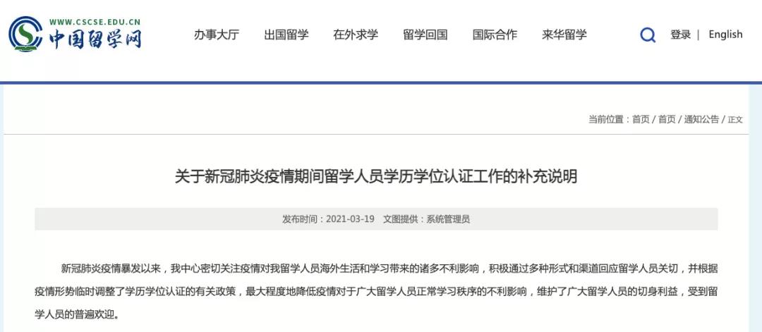 近日,教育部留学服务中心发布《关于新冠肺炎疫情期间留学人员学历学位认证工作的补充说明》。