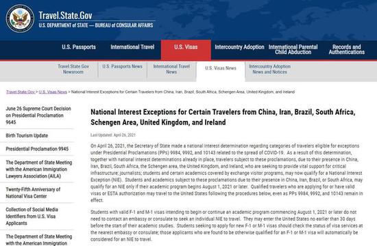 4月26日,美国国务院发布的一则声明显示,持有F-1或M-1留学签证,人在中国的学生将可以直飞美国学习。