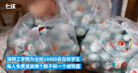 6月3日,江苏淮安。一高校为14400名学生每人免费发两个粽子和一个咸鸭蛋。校方称此举为纪念屈原,丰富学生校园生活,让他们过好端午节。学生称吃到粽子有家的感觉。