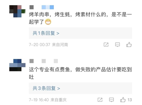 不少网友对烤鱼专业很感兴趣,还猜起了烤鱼专业的课业内容。“烤羊肉串、烤生蚝什么的,是不是一起学了?”