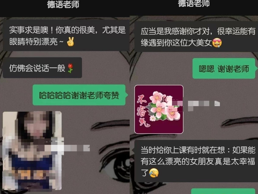 报道称,该网友表示,她于2022年在西安外事学院毕业,胡某是她第二外语老师,教授德语,在校期间二人交流的内容多是与考试相关,胡某也会时不时在她的朋友圈评论。毕业后,胡某也会发消息寒暄,但没有让她感觉不舒服。今年8月,胡某让她给其朋友圈文章投票点赞,她以为是群发消息,出于礼貌就给胡某投票点赞了。 9月16日,胡某突然给该网友发来标题为“女性荷尔蒙”的网络文章,她也没在意。此后,胡某开始夸她长得好看,用词越来越夸张,让她感觉十分不舒服。她对胡某发出提醒,多方假装不懂,并继续发一些自己是单身的暗示,因此她才选择网络曝光胡某的行为。 19日,记者尝试联系该网友,未获回复。不过,其在网络上发布的反映文章已经看不到。据此前媒体报道,聊天截图显示,该网友曾提醒该教师注意师德。 记者检索西安外事学院官网,未发现胡某的相关文章及简历。而在一份申报材料中显示,胡某出生于1968年,毕业于德国波恩大学,博士学历,教授德语语法、德国历史等课程,是专职教师。 19日,该校国际合作学院一名工作人员向记者证实,胡某曾是该学院德语系老师,并称胡某已不担任学院的教学工作。国际合作学院另一名工作人员表示,胡某目前已离职。胡某离职是否与上述言语骚扰女生一事有关?二人均表示不知情,“具体处理情况,二级学院也不便回应,需要咨询校级部门。” 19日下午,该校人事部门一名工作人员表示,学校已于9月17日与胡某解除了劳动合同,双方解除劳动合同与此前媒体报道胡某言语骚扰女生有关,但对于上述网友的相关情况,其并不了解。 声明:转载此文是出于传递更多信息之目的。若有来源标注错误或侵犯了您的合法权益,请作者持权属证明与本网联系,我们将及时更正、删除,谢谢。
