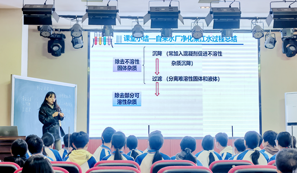 在课堂展示环节,广安友谊中学平安校区范怡佳老师带来英语课《Making new friends 拓展阅读》,以生动的互动设计与清晰的素养导向,展现了拓展阅读教学的新思路;王慧老师的化学课《水的净化》,则通过实验演示与数字化教具的结合,将抽象的化学原理具象化,赢得了听课教师的一致好评。五福学校教师全程专注观摩,认真记录课堂亮点与可借鉴的教学策略。
