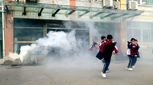 在防灾减灾应急疏散暨消防演练中,学校提前制定周密方案并部署。保卫处主任杨登平通过广播明确演练要求后,警报响起,师生在引导下迅速有序撤离至安全地带。保安队长向明阳现场演示消防器材使用,通过师生代表实际操作使用,切实提升消防安全能力。