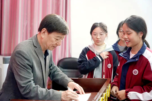 讲座结束后,杨芸芸副校长代表学校向马教授赠送纪念品,学生代表献上鲜花表达敬意。同学们还排起长队,手执笔记本请老科学家签名留念。马教授耐心地为每位同学签名,并深情寄语:“希望同学们保持对科学的好奇心,勇于探索未知,未来为中国的科学发展贡献力量。”
