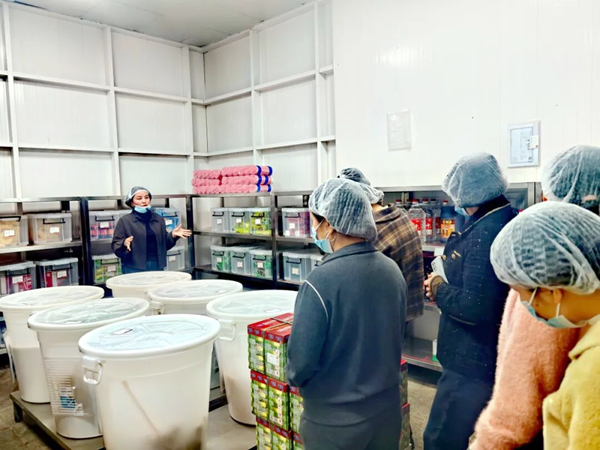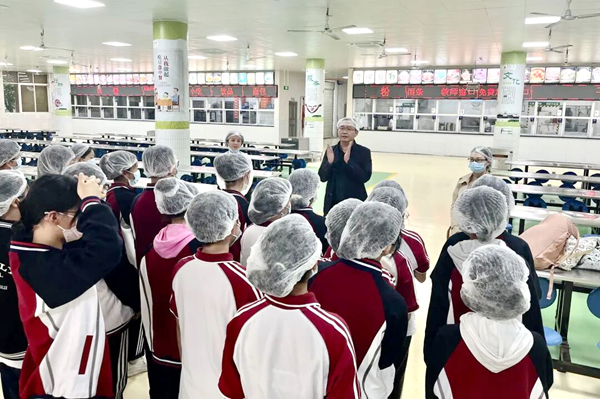 食堂劳务经理石敏担任“向导”,耐心讲解参观注意事项,并为每位家长分发卫生帽,确保参观过程的规范与卫生。在石敏的引导下,家长们有序走进食堂后厨、仓库、洗消间等重点区域,零距离观摩食材储存、加工制作、餐具消毒等全流程运作,全面了解学校食堂的日常管理。