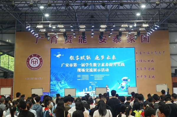 4月19日,广安市第一届学生数字素养提升实践现场交流展示活动在四川省广安中学举行。本次活动由广安市教育和体育局主办,广安市电化教育馆、广安区电化教育馆承办,广安中学协办,旨在全面落实新时代中小学科学教育工作要求,深入推进国家教育数字化战略行动,扎实做好科学教育加法,提升学生数字素养,助力全市中小学生德智体美劳全面发展。来自全市50余所学校的领队、指导教师、评委专家及参赛学生400余人齐聚广中,共赴这场数字科创的青春盛会。
